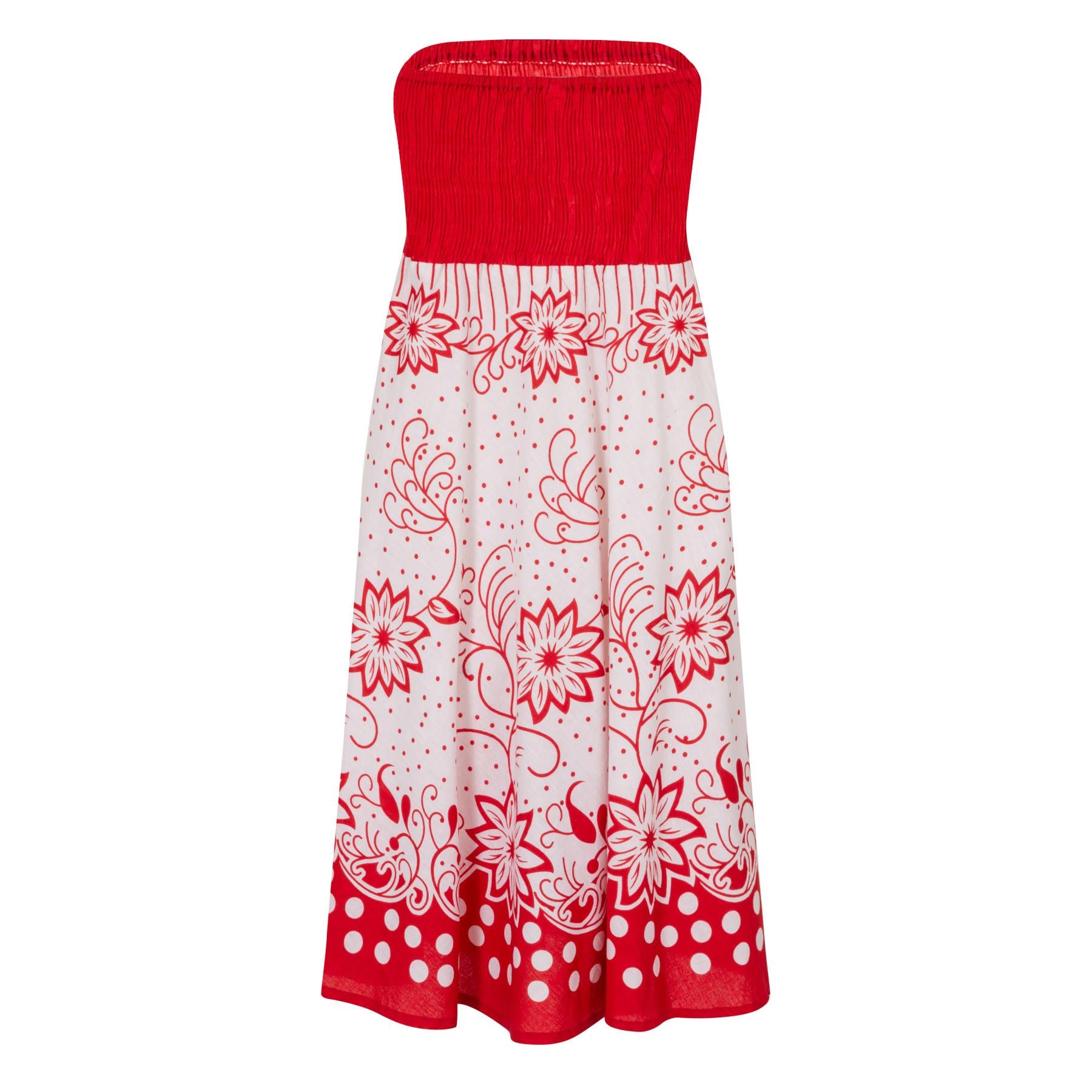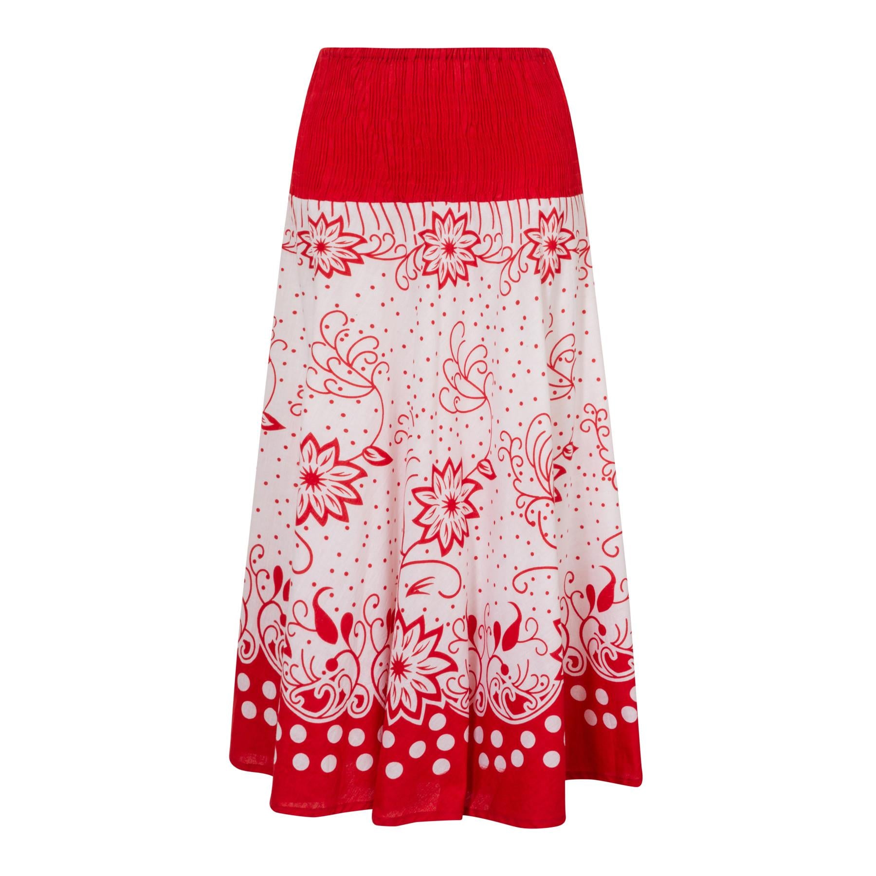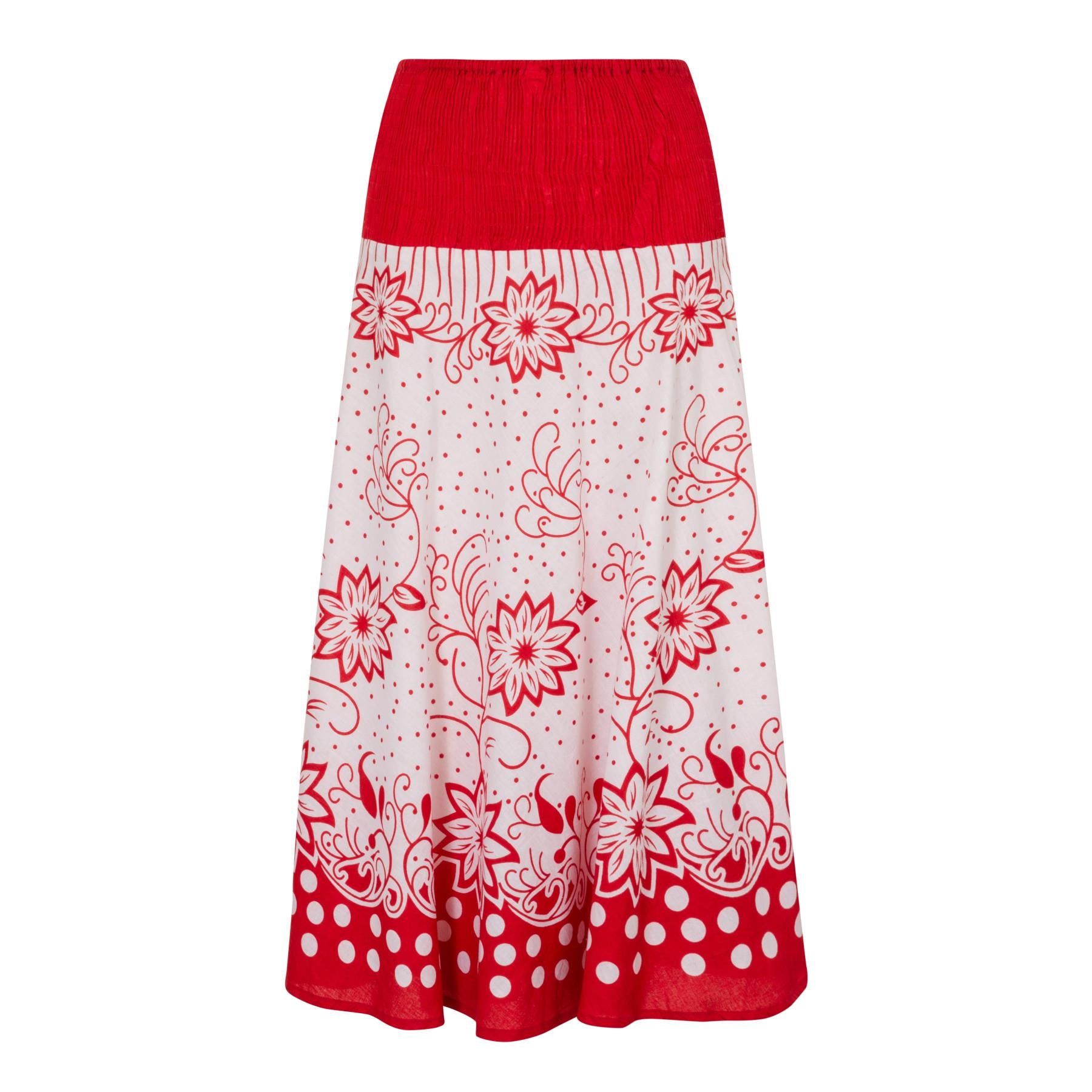 Women's 2 in 1 dress with a dotty print design, in red. It can be worn strapless or as a maxi skirt. Approximately 35 - 36 inches in length.