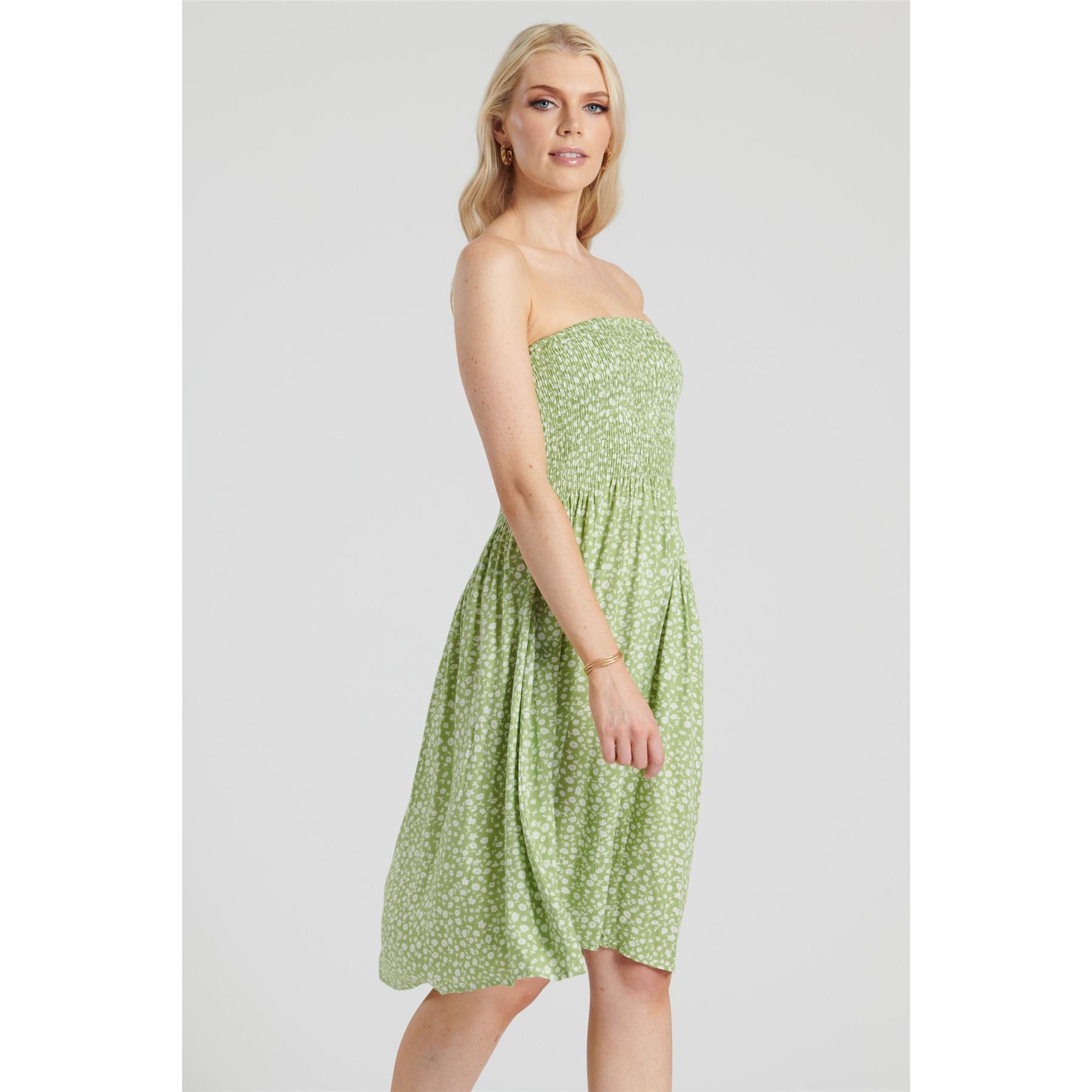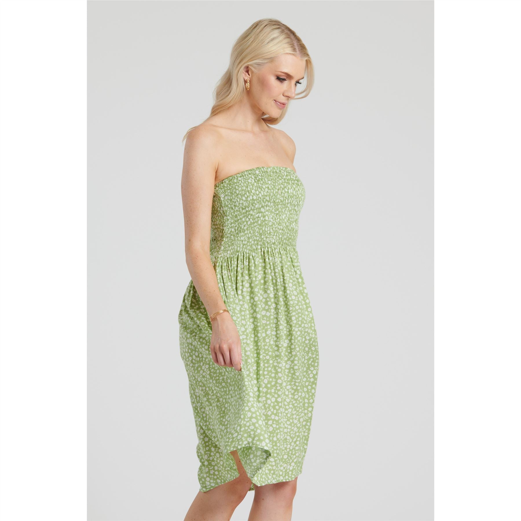Women's 3 in 1 dress with ditsy floral print, in green. It can be worn strapless, with bandeau neck fastening or as a maxi skirt. Approximately 36 inches in length, excluding neck tie.