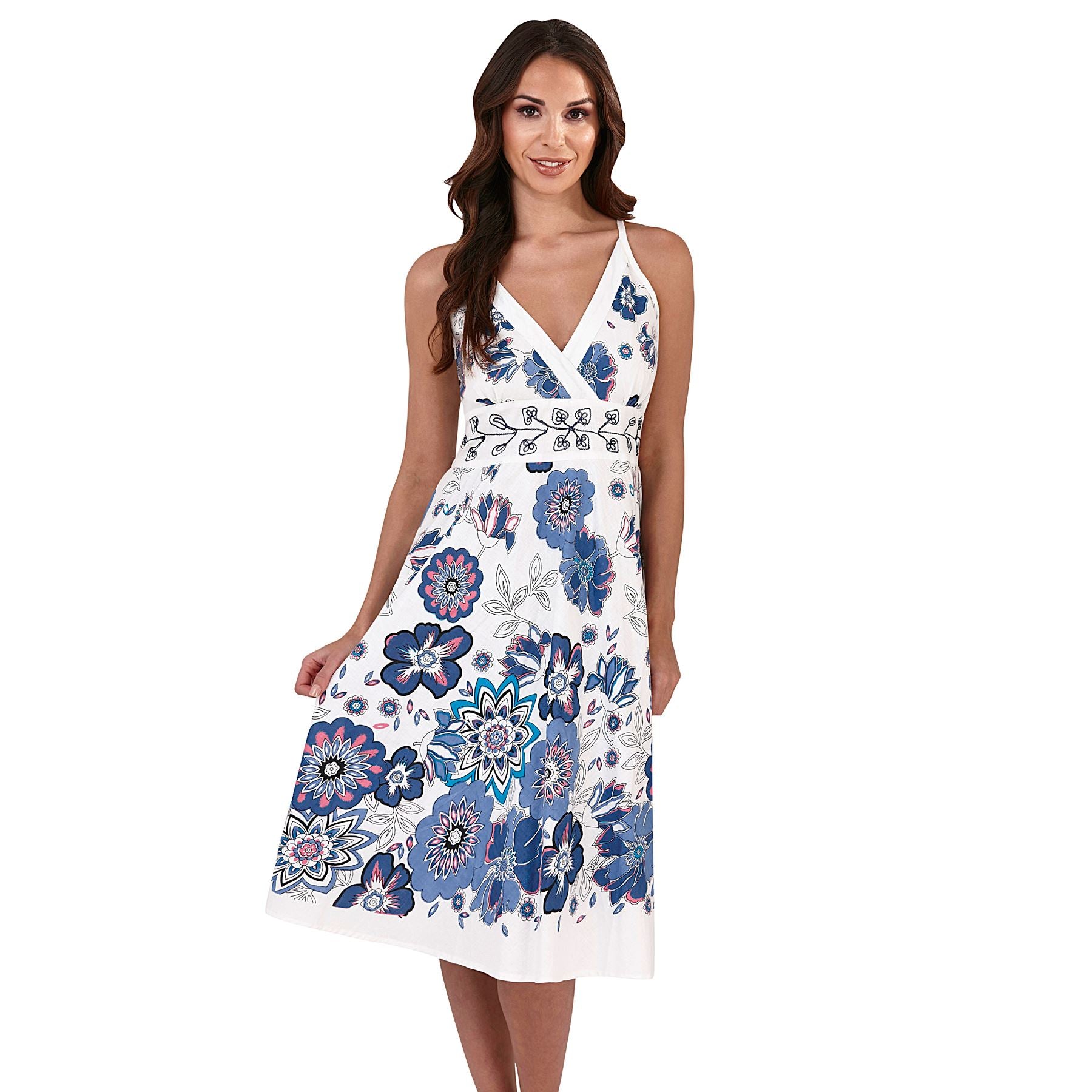 Women's crossover dress with a bold floral print on a white base. Approximately 42 - 43 inches in length.