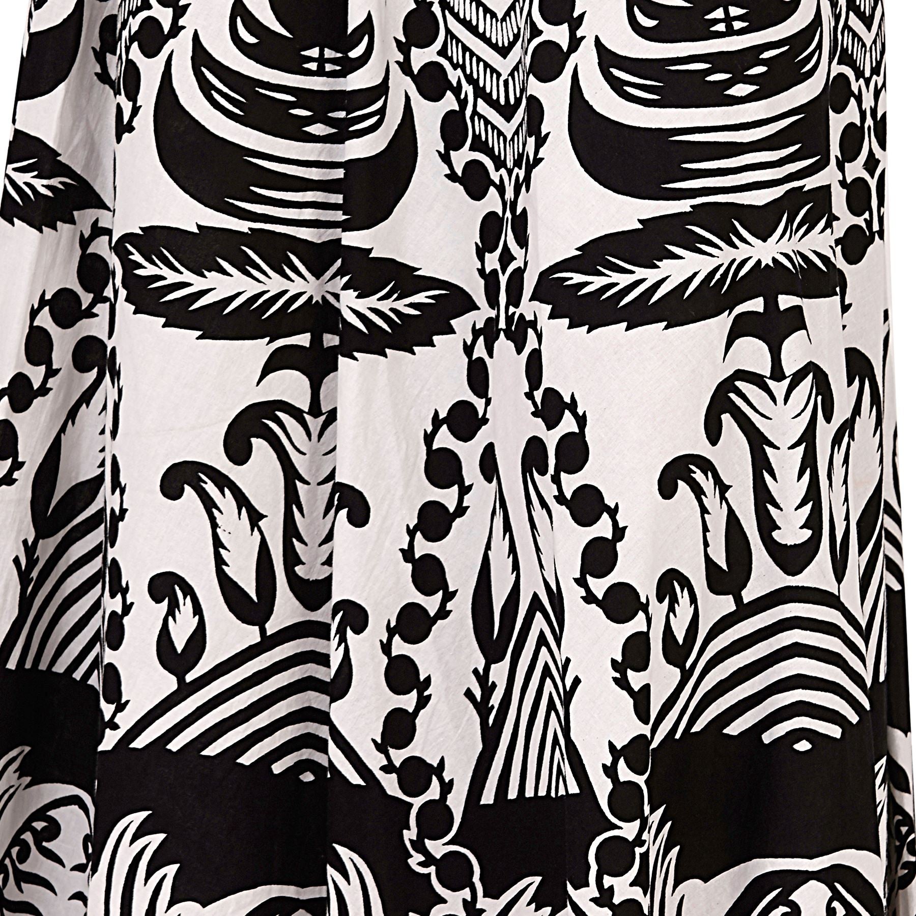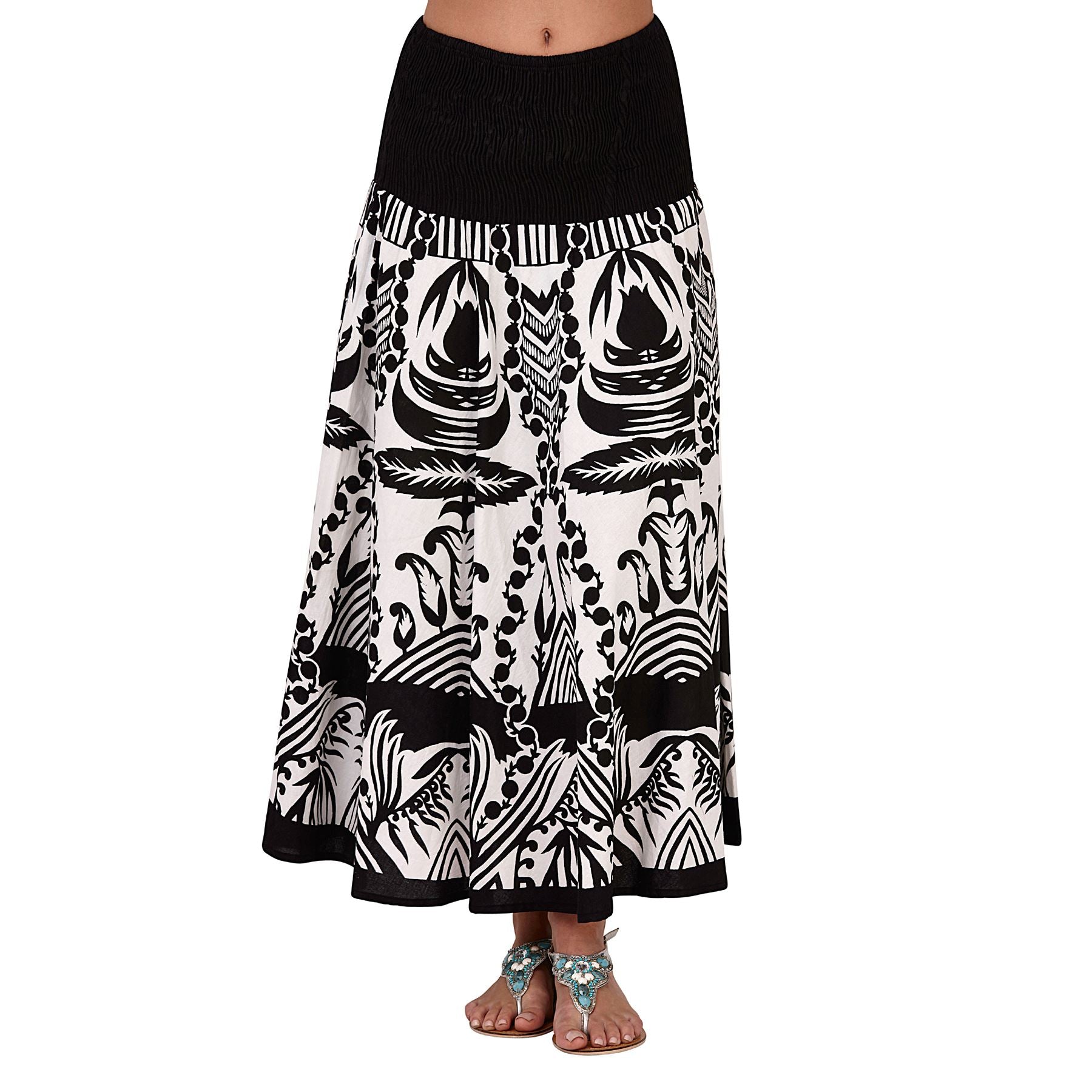 Women's 2 in 1 dress with floral printed design in black. It can be worn strapless or as a maxi skirt. Approximately 36 inches in length.