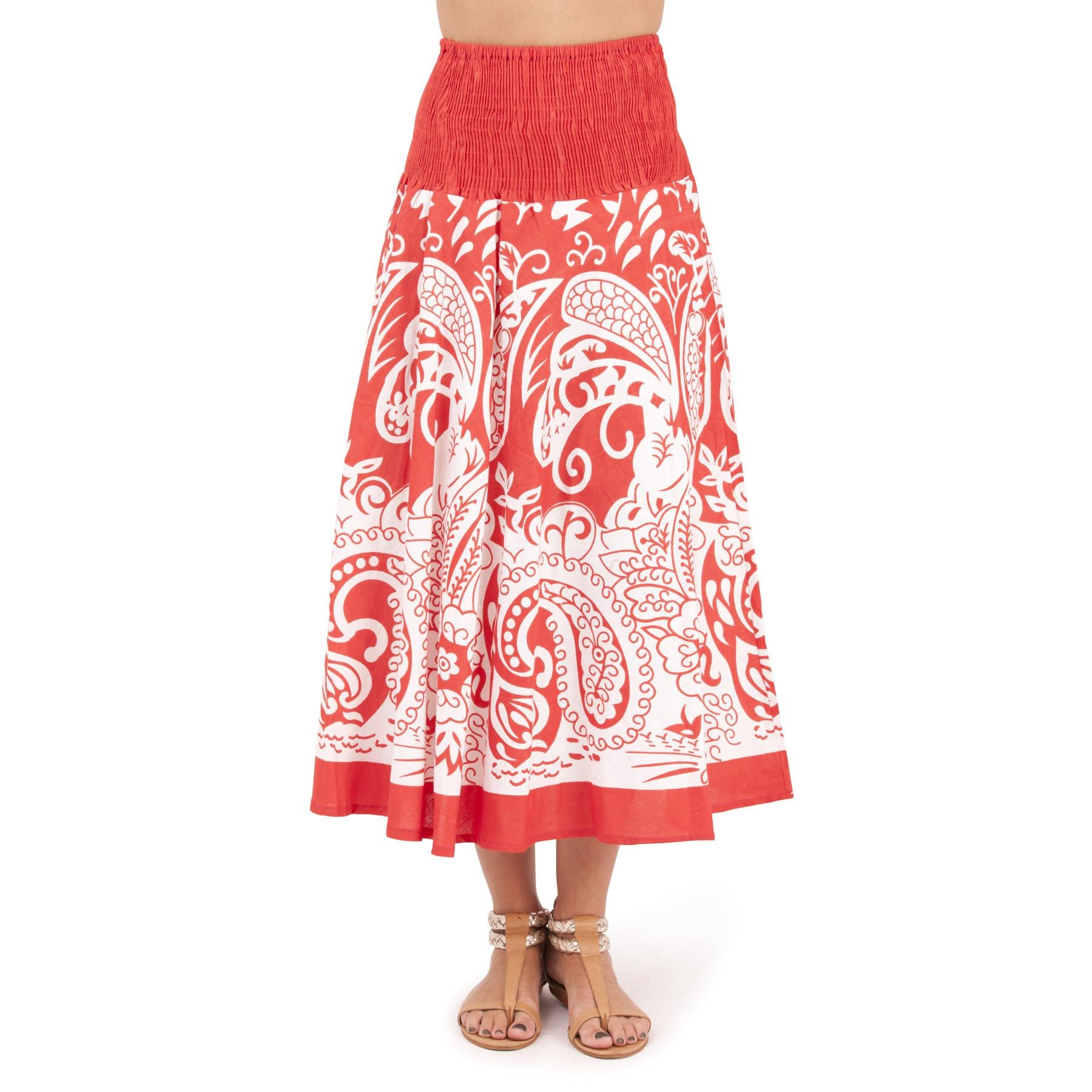 Women's 2 in 1 dress with paisley print, in red. It can be worn strapless or as a maxi skirt. Approximately 36 inches in length.