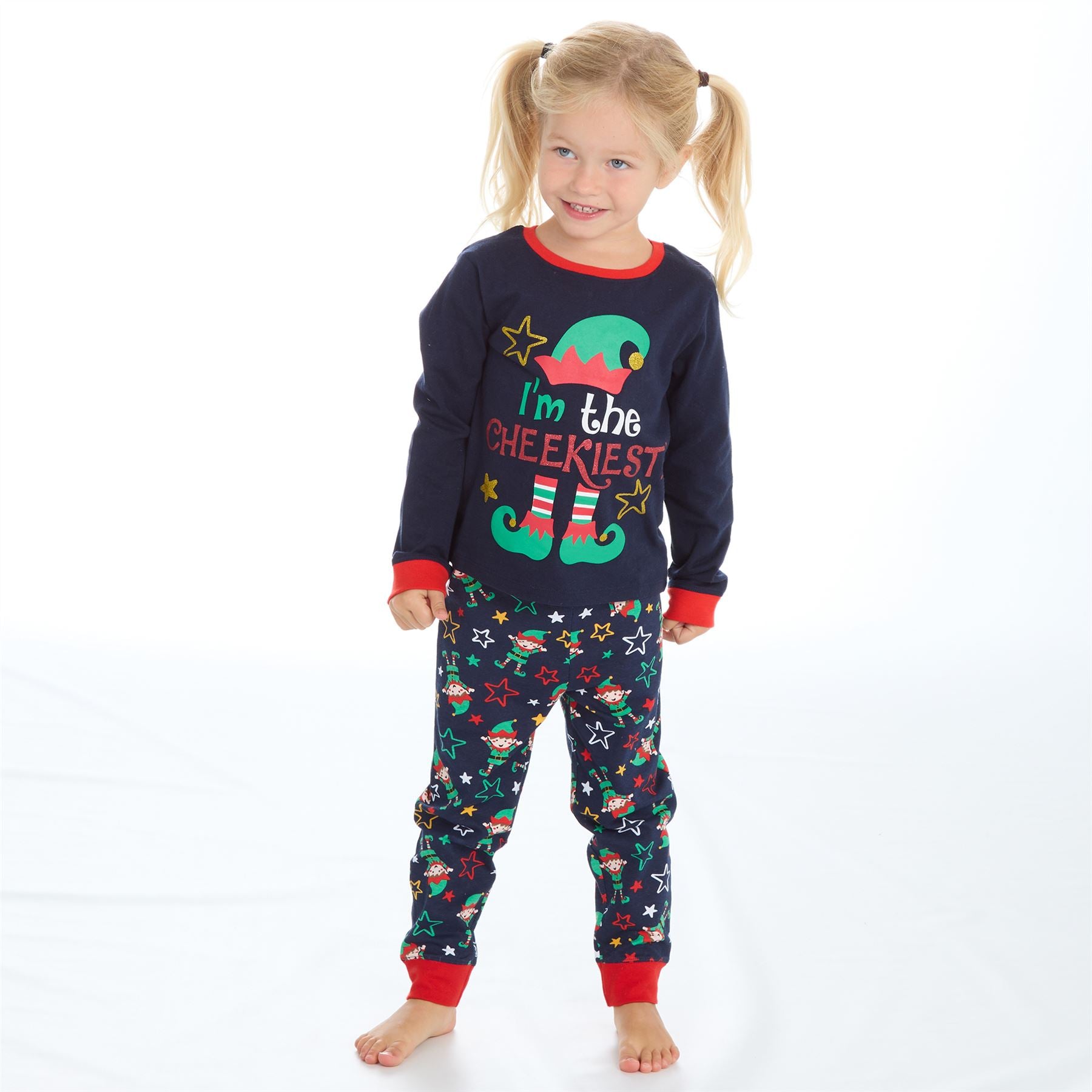 Kids' long sleeve Christmas pyjamas with 'I'm The Cheekiest' slogan on the top and elf print bottoms.