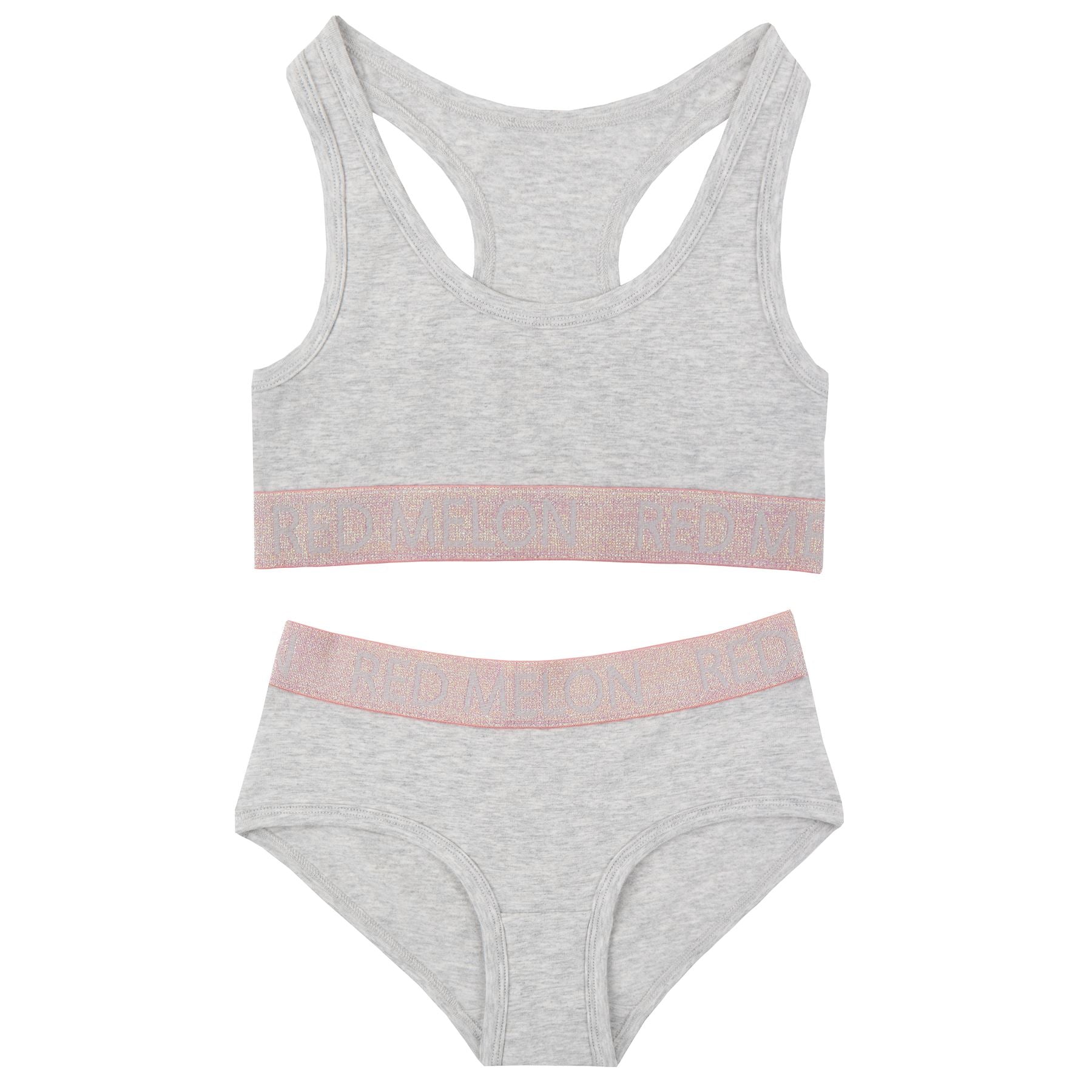 Girls' crop top bra and brief set in grey marl, with 'Red Melon' branding at the base of the top and on the waistband.