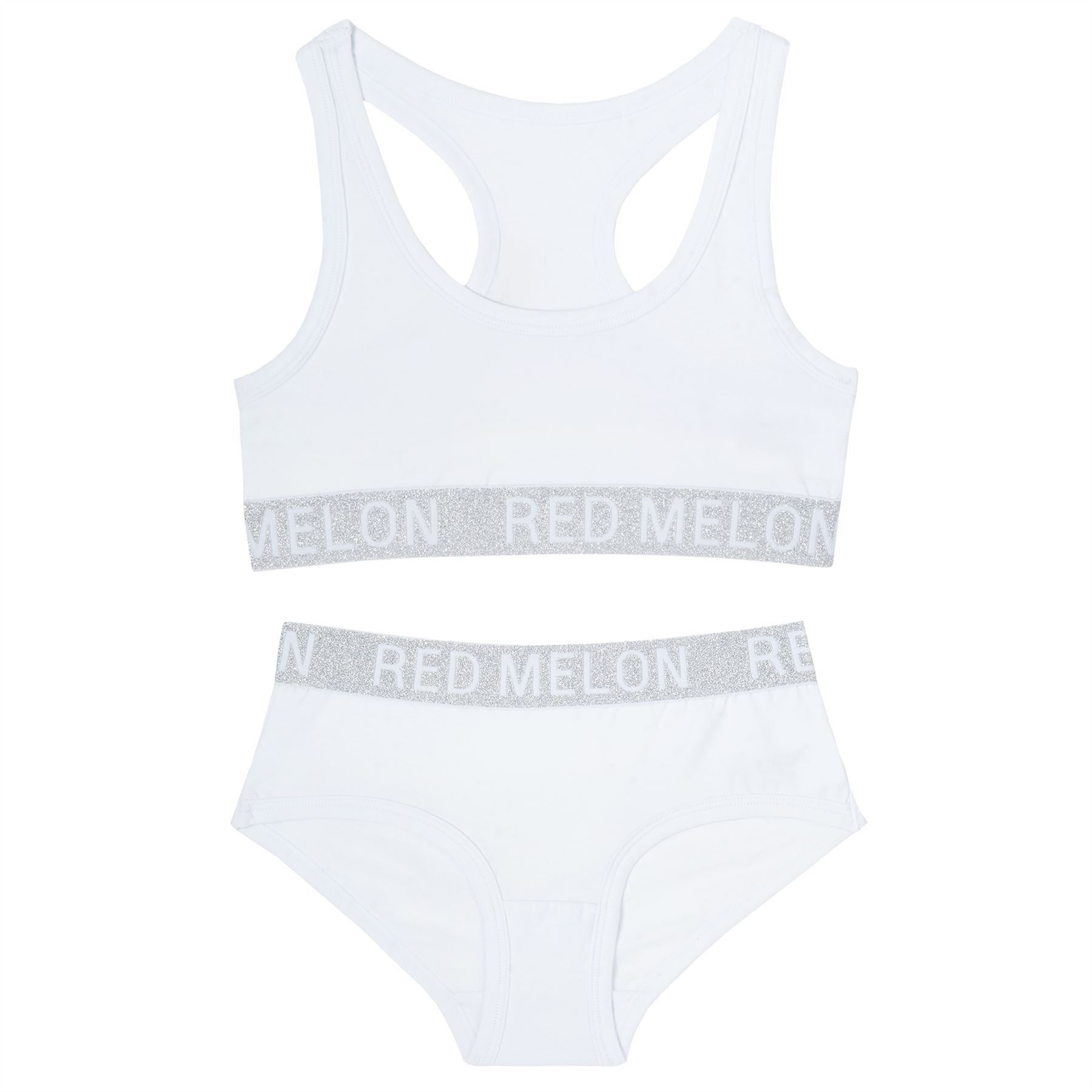 Girls' crop top bra and brief set in white, with 'Red Melon' branding at the base of the top and on the waistband.