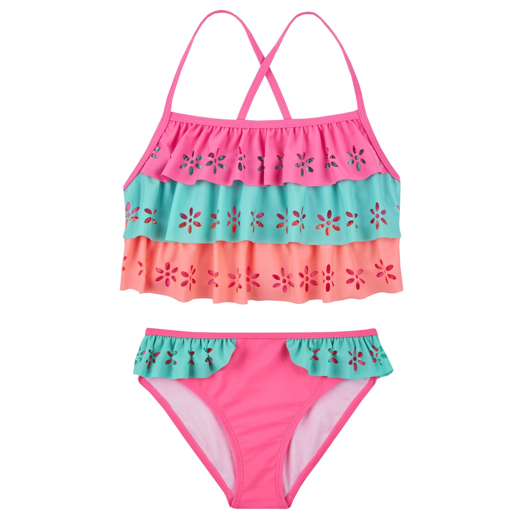 Girls' multi coloured bikini set, with laser cut floral pattern and frill detail.