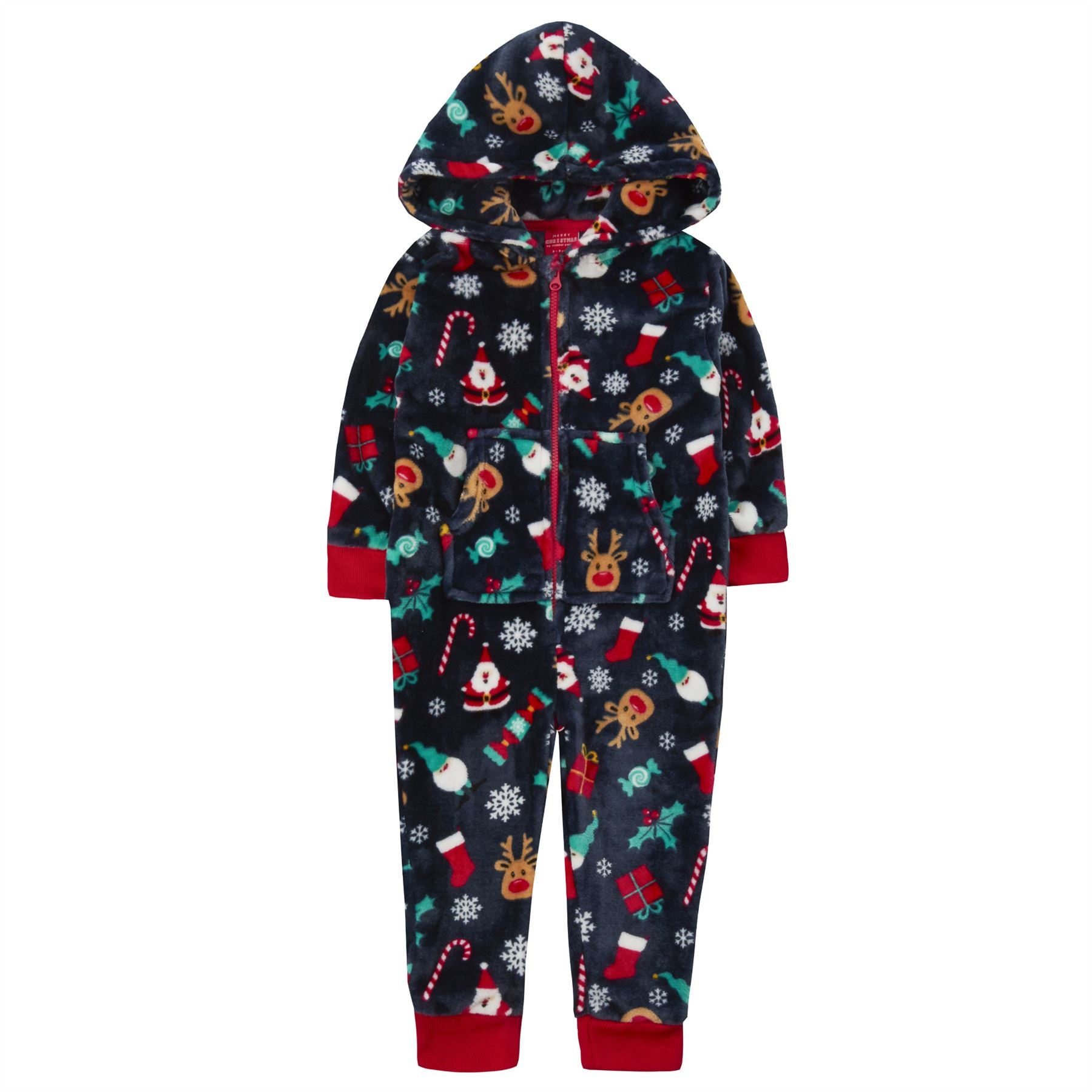 Kids' hooded fleece onesie in navy, with a Christmas design and zip up front.