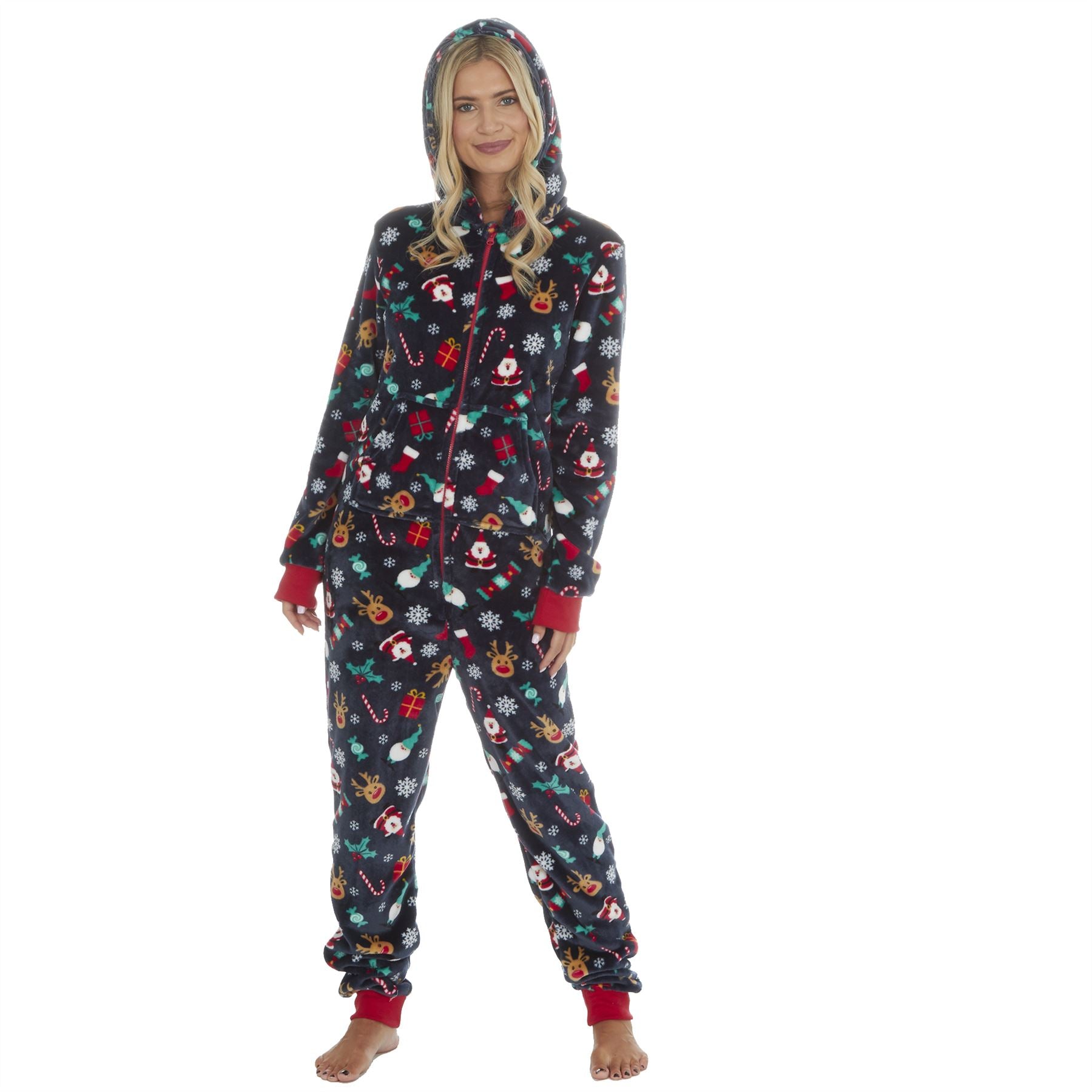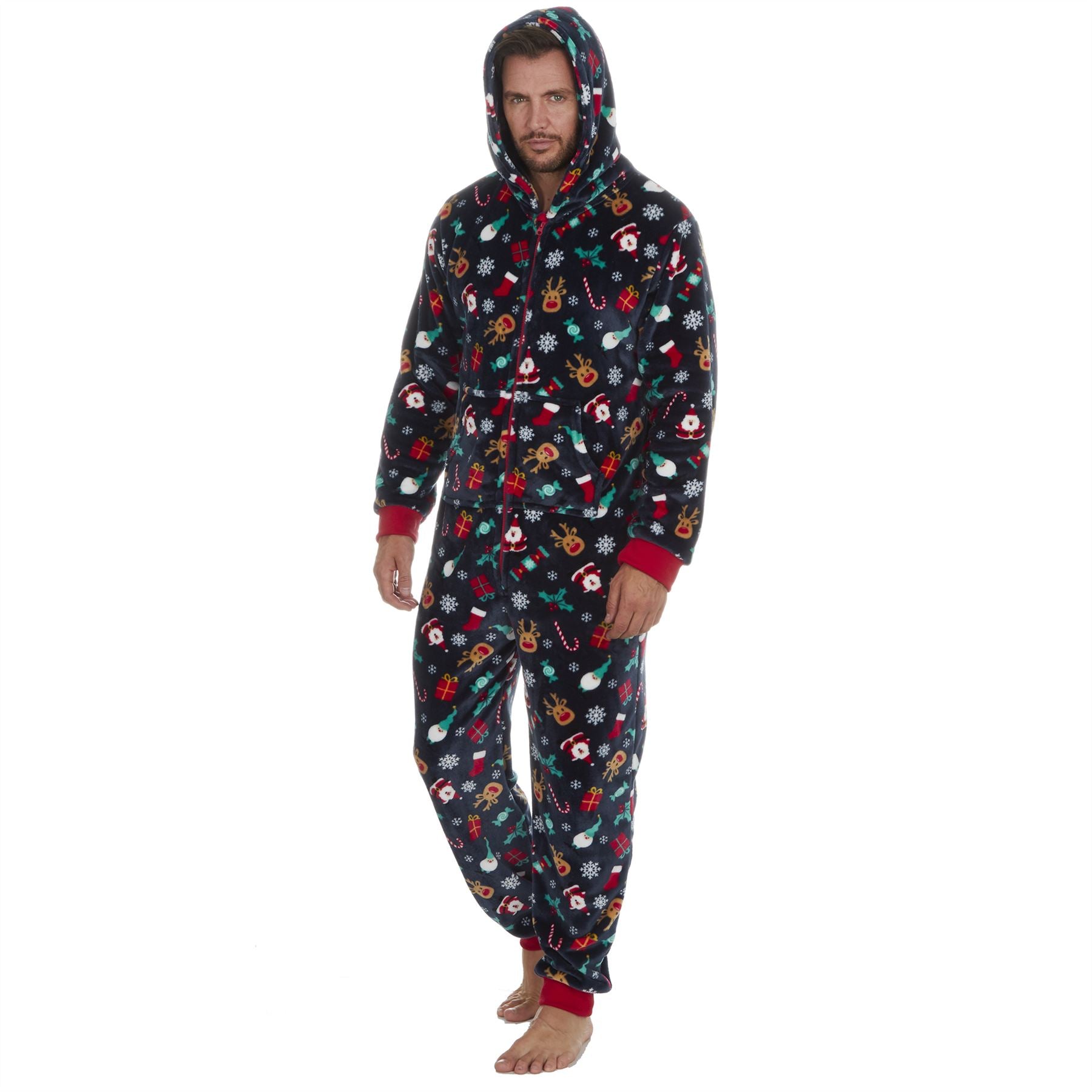 Adults' unisex flannel fleece navy Christmas onesie, with a printed design featuring presents, Santa, holly and candy canes. It has a zip up front, pockets and ribbed cuffs and ankles.