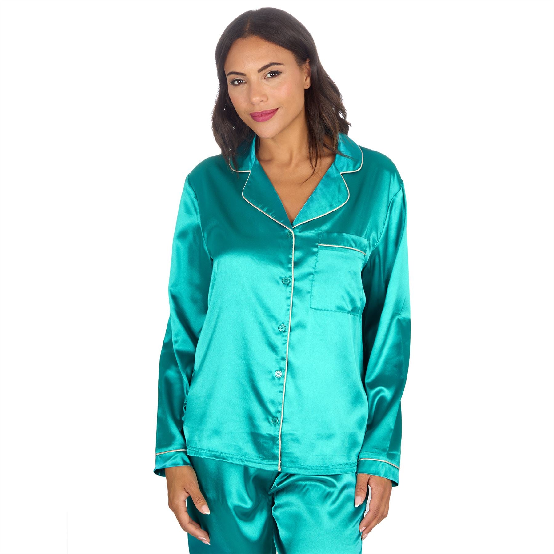Women's long sleeve satin pyjamas in teal, with button through front, trim detail and a chest pocket. The bottoms have an elasticated waistband.