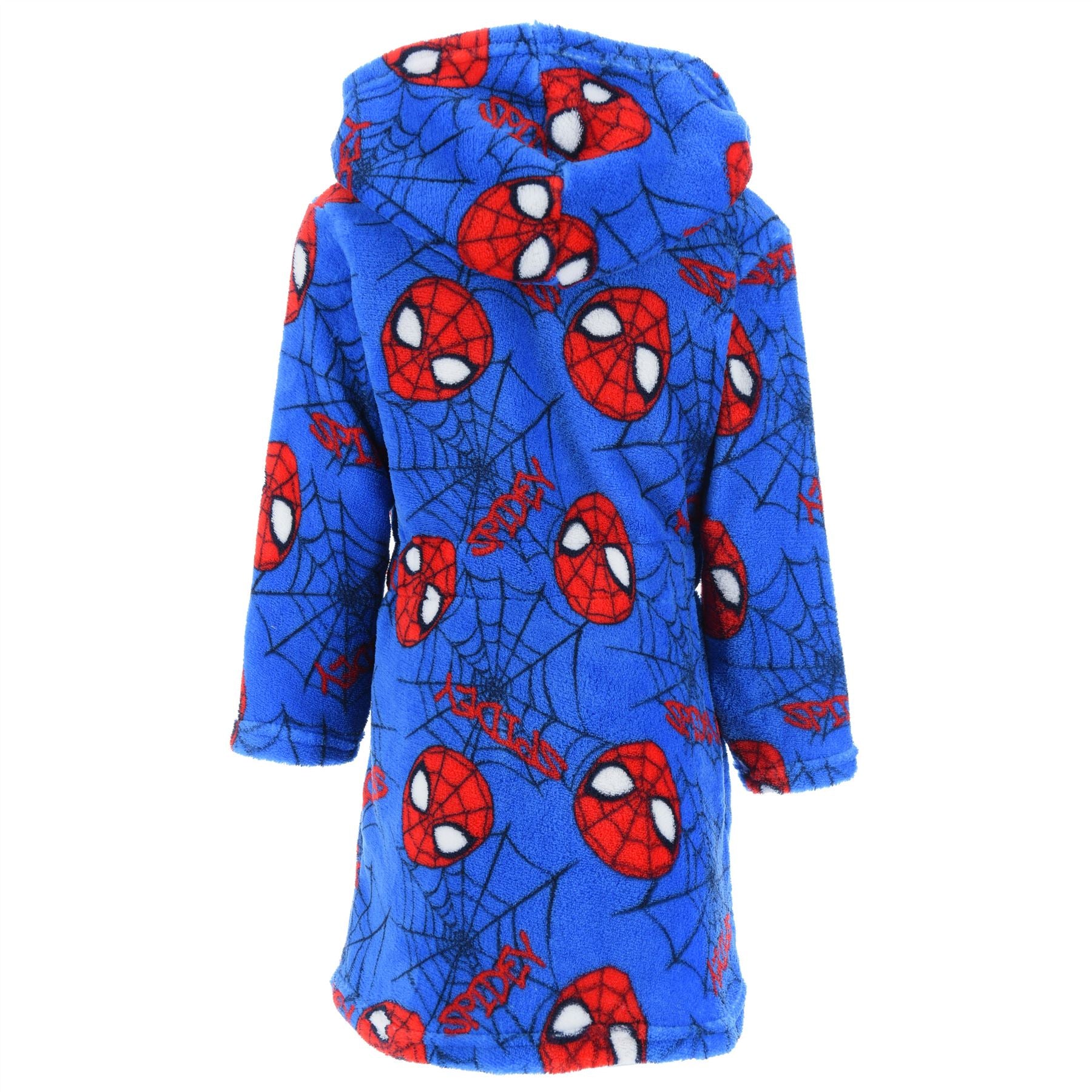 Kids' Spiderman fleece robe in blue, with printed 'Spidey' detail and a hood. It has pockets and a matching tie belt. 3 Years (to fit height 98cm), 4 Years (to fit height 104cm), 5 Years (to fit height 110cm), 6 Years (to fit height 116cm), 8 Years (to fit height 128cm), 10 Years (to fit height 140cm).
