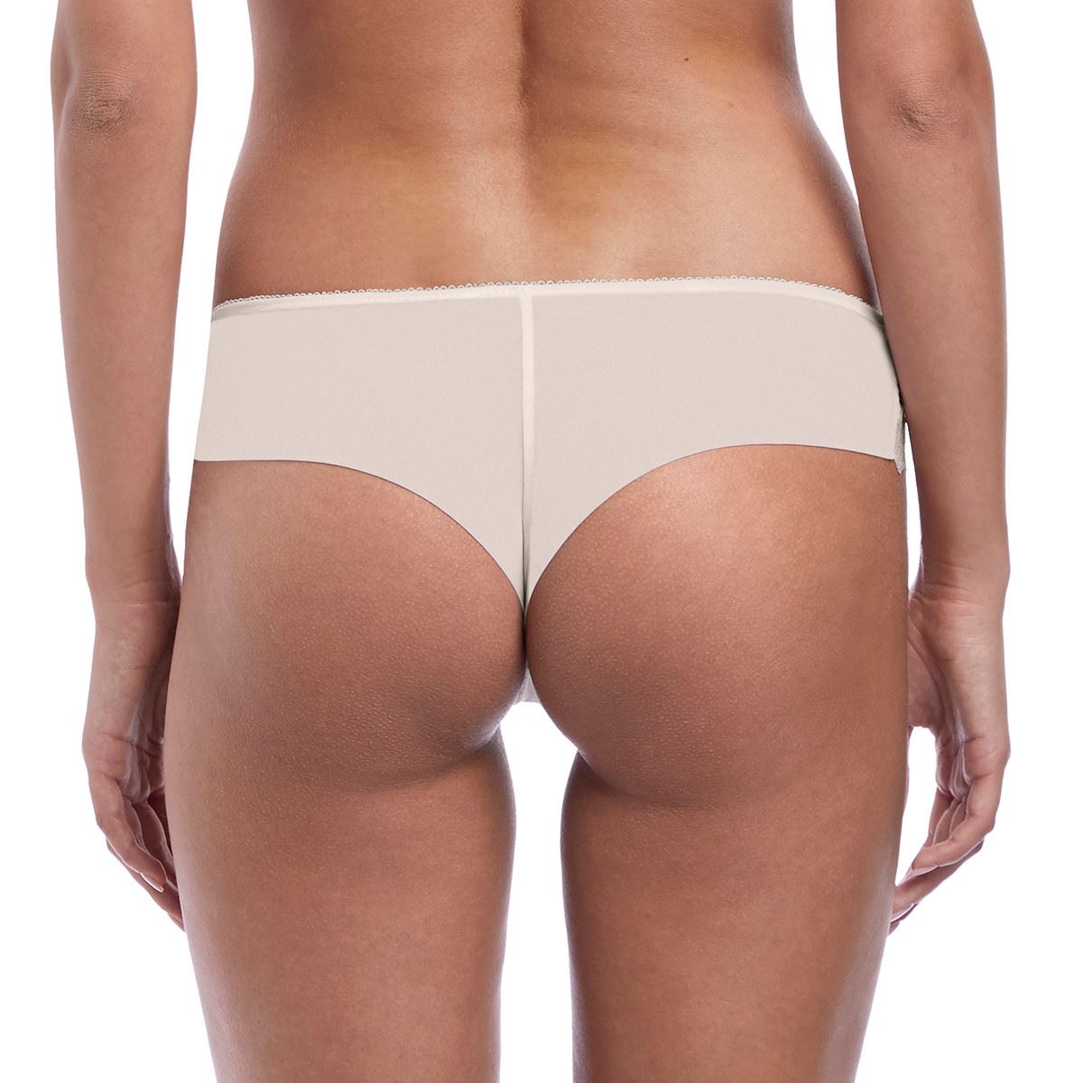 Wacoal Lace Essentiel tanga in cream/powder, with a lined lower front panel, stretch lace waist section and a double layer mesh back.