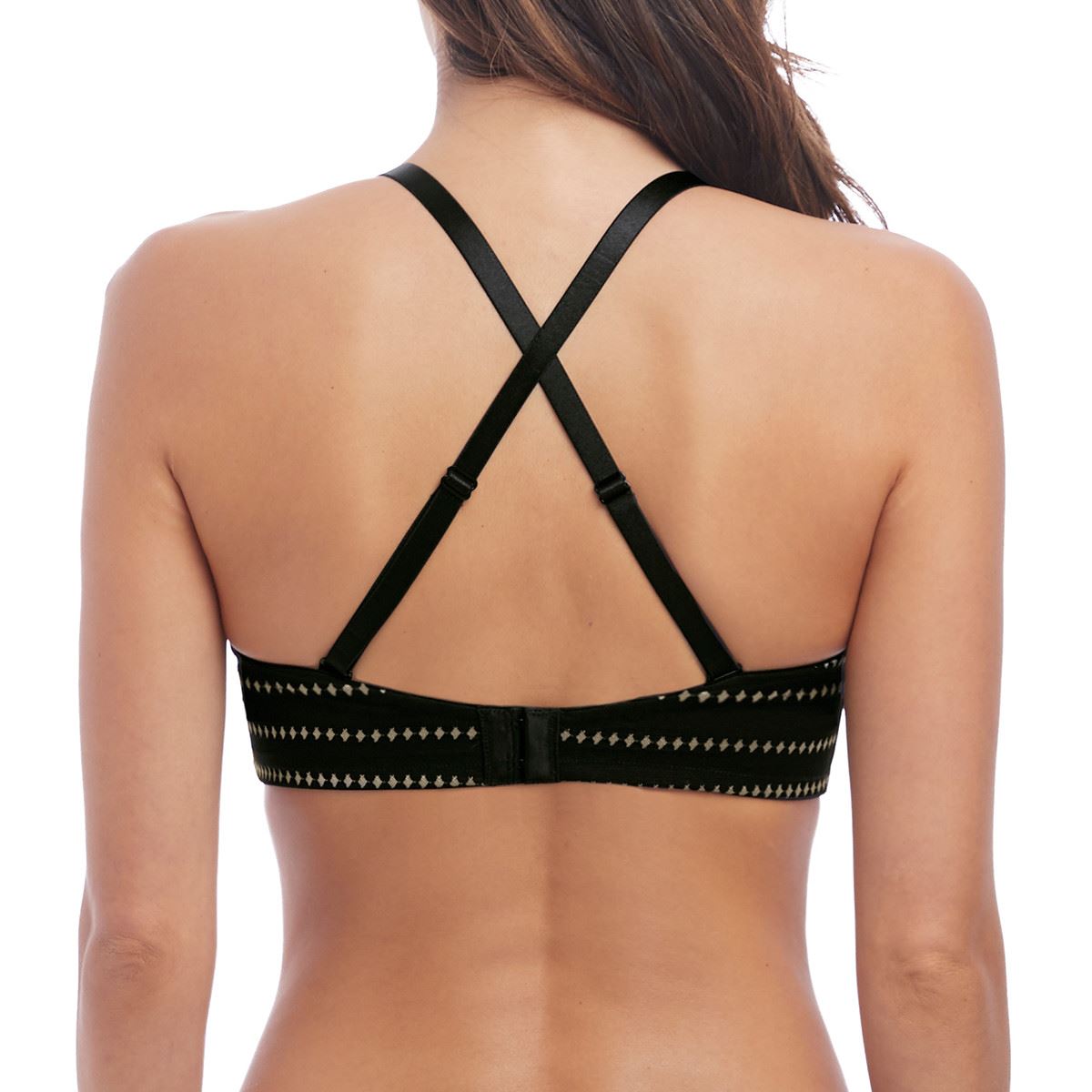 Wacoal Respect strapless bra in black/champagne. It is underwired, with seam free, moulded cups. The bra features gripper elastic and lace detail across the back and a ribbon bow in the centre. Matching straps are included, which are fully adjustable and detachable. The bra has multi position fixings and can be worn strapless, with normal or crossover straps.